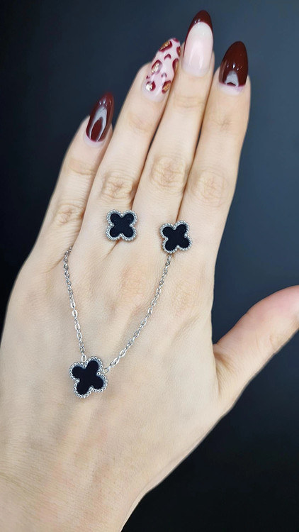 نیمست استیل طرح Van Cleef رنگ نقرهای، با طراحی گل چهارپر کلاسیک، جلوهای ظریف و چشمنواز به استایل شما میدهد.
