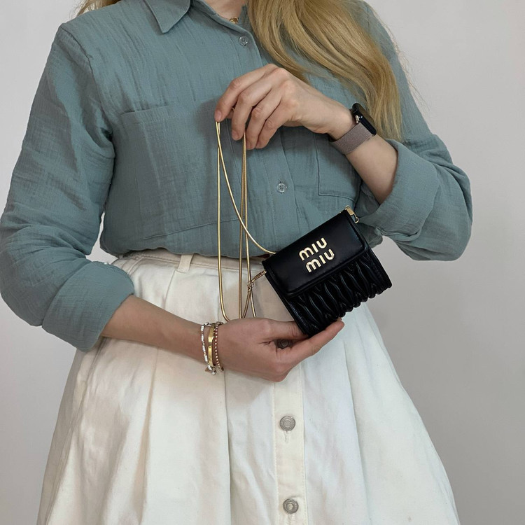کیف زنانه برند Miu Miu، طراحی خاص و شیک با بند زنجیری طلایی و بدنه چرمی مشکی براق. این کیف سایز کوچک، مناسب استفاده روزمره و مجالس رسمی است؛ ترکیب ظرافت ایتالیایی و طراحی مدرن که استایل شما را خاصتر میسازد.