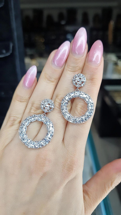 سطح گوشواره کاملاً با نگینهای درخشان ریز و باریک (تراش باگت و راند) پوشانده شده، بهگونهای که با هر حرکت، انعکاس نور برقمانند ایجاد میکند.