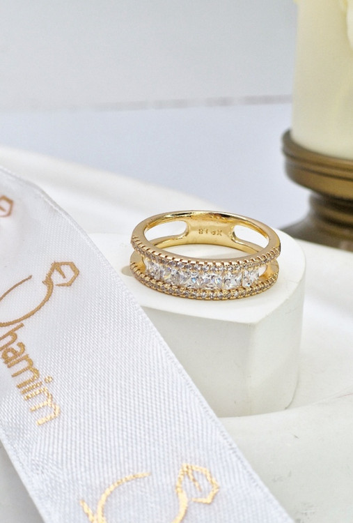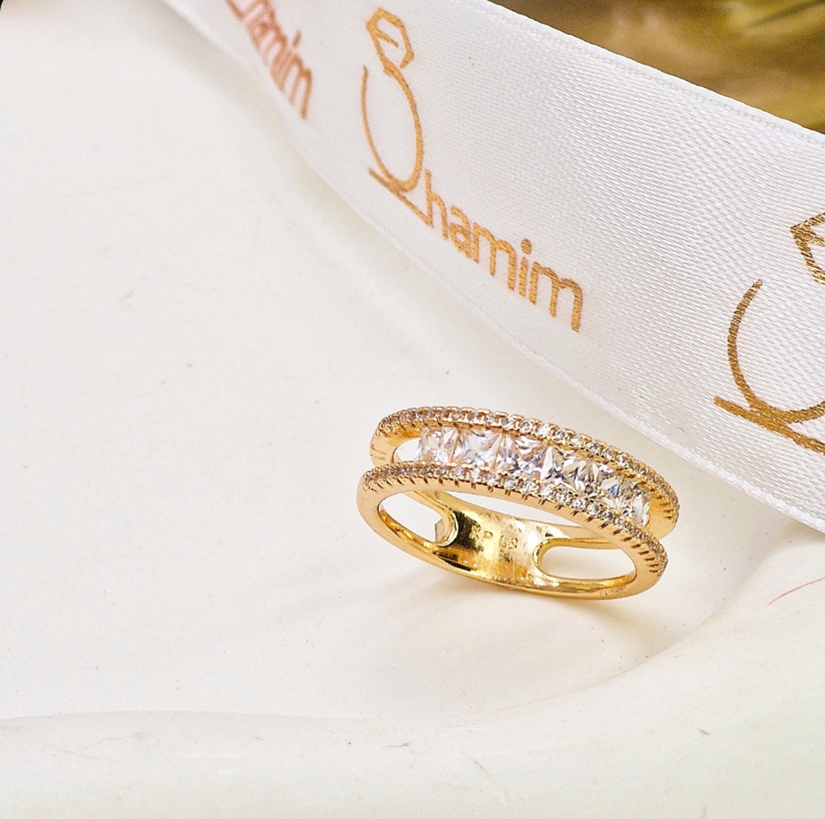 این انگشتر نمادی از تقارن مدرن و طراحی هوشمندانه است. به جای استفاده از نگینهای گرد سنتی، این قطعه از دو نگین برش باگت بهره میبرد که به صورت موازی یا متقاطع در دو سر باز انگشتر قرار گرفتهاند. برش باگت، با خطوط صاف و هندسی خود، درخشش متفاوتی ایجاد میکند که بسیار شیک و معاصر است.
