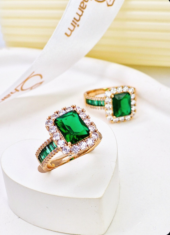 انگشتر ژوپینگ زنانه؛ نگین مستطیل سبز تراش زمردی با رکاب کامل جواهرنشان