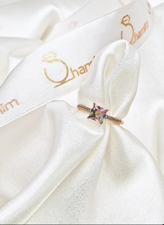 انگشتر ژوپینگ (Juping) مدل ظریف نگین مربعی هفترنگ، ترکیبی بینظیر از سادگی کلاسیک و جادوی رنگهاست. در مرکز این انگشتر، یک نگین شفاف با تراش مربعی قرار گرفته که دارای پوشش خاص هفترنگ (Rainbow/AB Coating) است. این پوشش باعث میشود نگین در زوایای مختلف نور، طیفی خیرهکننده از رنگهای رنگینکمان را به نمایش بگذارد.
