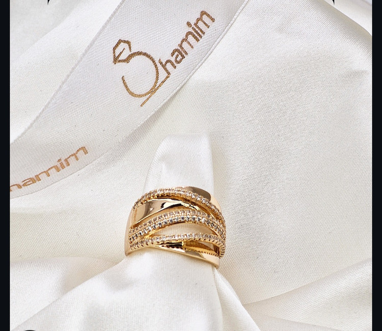 تقریباً تمام سطح بیرونی انگشتر با ردیفهای متراکم از نگینهای کریستالی ریز پوشانده شده است (تکنیک Pave یا میکروپوته). این تراکم بالا باعث میشود که انگشتر در هر زاویهای که نور به آن برخورد میکند، نوری خیرهکننده و یکپارچه ساطع کند؛ گویی یک قطعه طلای خالص و نگیندار است. آبکاری طلا در این مدل بسیار با دوام انتخاب شده تا درخشش آن برای مدت طولانیتری حفظ شود. این انگشتر یک انتخاب عالی برای ساختن یک “بیانیه” (Statement Piece) در استایلهای رسمی و شبانه است.