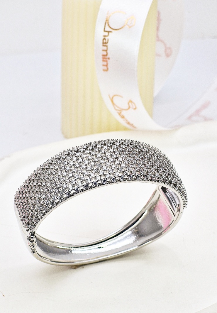 فرم پهن و النگویی دستبند، حس اصالت و قدرت را القا میکند. درخشندگی متمرکز بخش نگیندار باعث میشود با هر حرکت دست، انعکاس نور چند برابر شود — انتخابی ایدهآل برای مراسمها، میهمانیهای شب و استایلهای رسمی.
